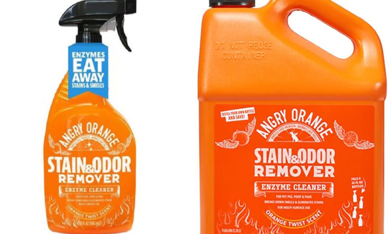 The bottles feature an orange and white design with “Angry Orange” and “Stain & Odor Remover” clearly labeled on the front.