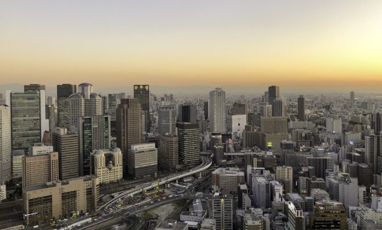 A stunning sunset view over Osaka towards the Dojima River, showcasing the modern city skyline of Osaka. The vibrant orange hues of the sunset create a beautiful contrast against the backdrop of the city.