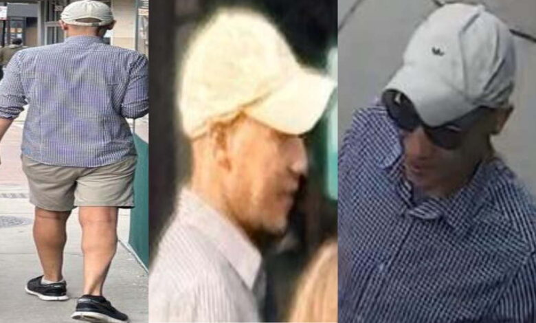 The suspect is described as being between 40 to 49 years old, of unknown race, standing approximately 5 feet 9 inches to 5 feet 10 inches tall, and weighing around 150 pounds. He was wearing a white baseball cap, sunglasses, a buttoned-down blue-checkered shirt, tan shorts, and black gym shoes with white soles.