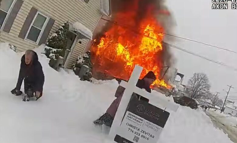 Dramatic footage captures Mass. cops hunting for hydrants under snow during blaze