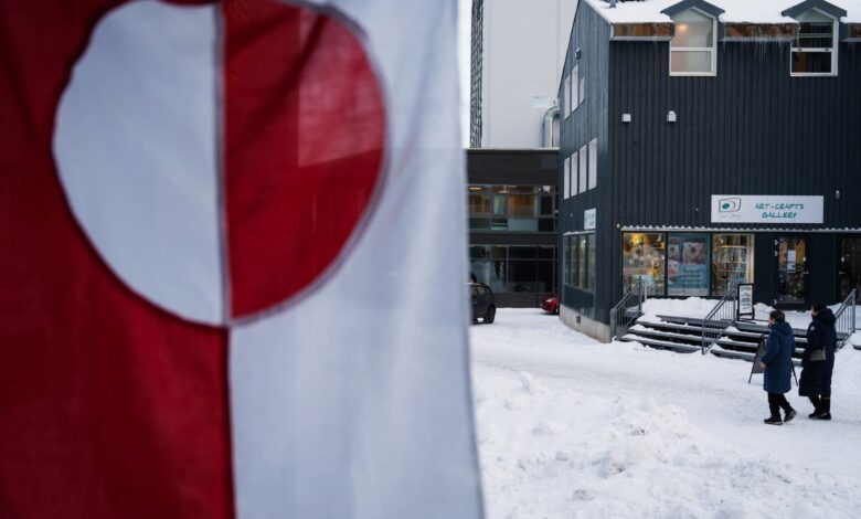 Greenlandic flags are displayed on a building in Nuuk, Greenland, on January 14, 2026.