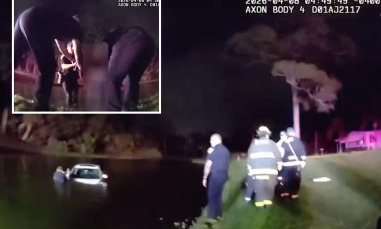 Florida police rescue elderly couple after car slides into pond following heavy downpours