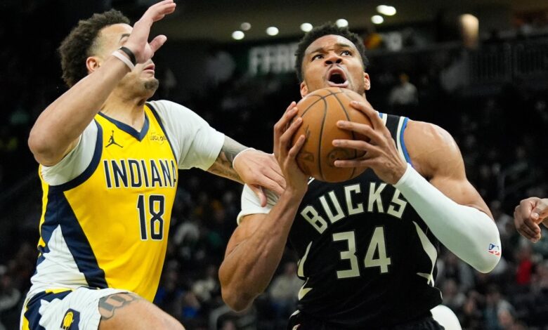 Giannis Antetokounmpo leaves Bucks’ victory over Pacers after landing awkwardly on dunk