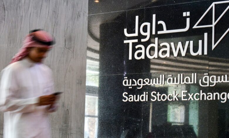 This image taken on December 12, 2019, depicts the Saudi Arabia’s Stock Exchange Market (Tadawul) logo in Riyadh.