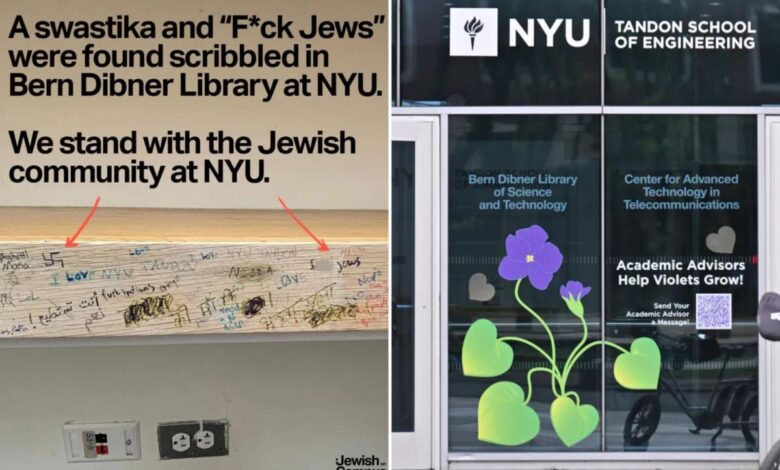 Hateful graffiti was discovered inside an NYU library in downtown Brooklyn this week, sparking outrage and condemnation from campus officials and law enforcement. The disturbing messages, including a swastika and derogatory statements targeting various ethnic groups, were found scrawled on the wall of the Bern Dibner Library at 4 MetroTech Center.