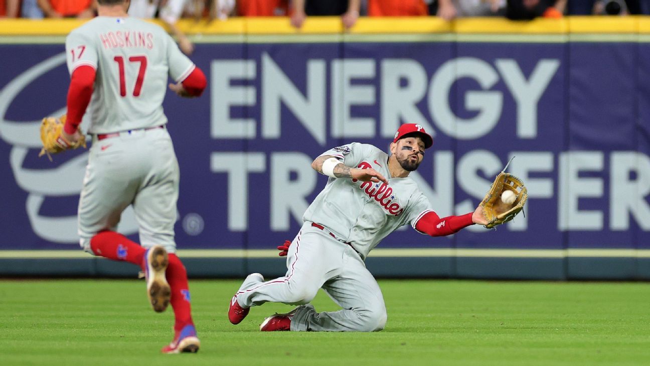 HOUSTON — The Philadelphia Phillies came to Minute Maid Park for Game 1 of a World Series they weren’t supposed to make, found themselves in a five-run hole against the best pitcher in the American League this year, erased the deficit with singles and doubles so foreign in this home run-happy postseason, almost lost the game in the ninth inning until a guy regarded by defensive metrics as the game’s single worst fielder over the past decade made an incredible sliding catch, went ahead with the first extra-innings home run by a catcher in a World Series game since Carlton Fisk waved the ball fair in 1975 and finished with a 37-year-old registering a save shaky enough to trick a seismograph.