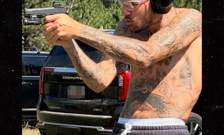 Justin ditched his shirt for the shooting spree … and he brought some extra guns along … because, as you can see, the dude is kinda jacked underneath all those tattoos.