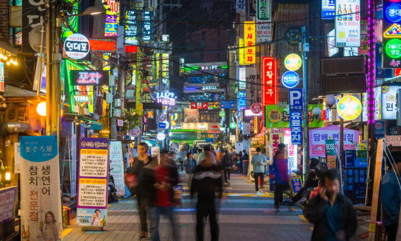 People walking through the neon lit night streets of Sinchon in the heart of Seoul, South Korea’s vibrant capital city.