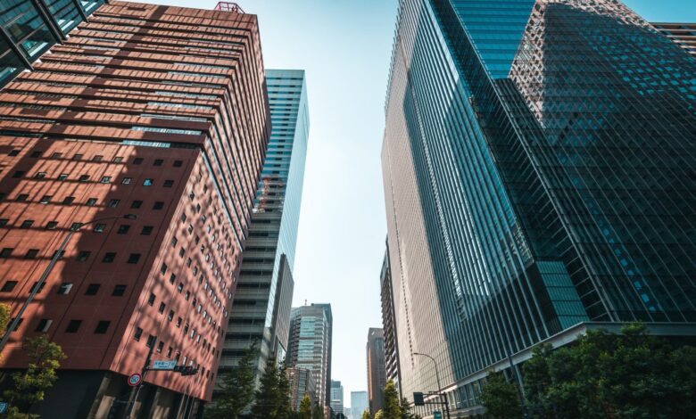 Low angle view of tall buildings in Tokyo, Japan, showcasing diverse architectural styles