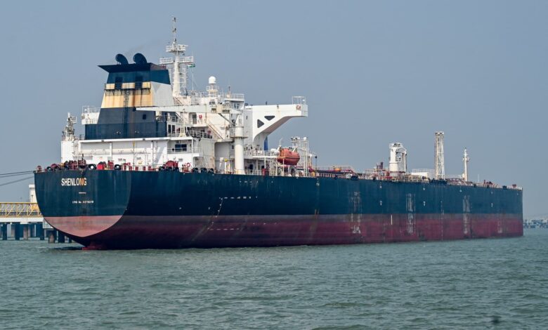 The Liberia-flagged crude oil tanker Shenlong Suezmax successfully docked at Mumbai Port after navigating the high-risk Strait of Hormuz amid the intensifying West Asia conflict on March 11, 2026 in Mumbai, India.