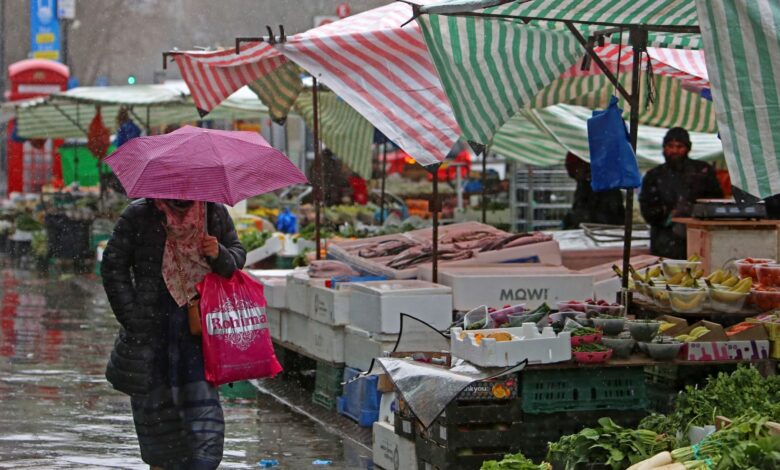 LONDON – March 31, 2023: A pedestrian seeks shelter from the rain while passing by a market stall displaying fruits and vegetables in east London. Recent data released on Weds, April 19 revealed a 19.2% increase in food and non-alcoholic beverage prices in the year leading up to March 2023, marking the sharpest annual rise in over 45 years.