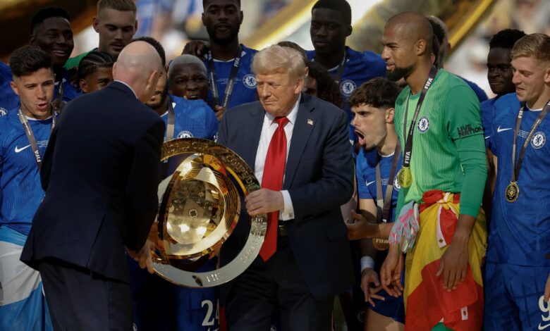 U.S. President Donald Trump looks on as Chelsea Captain Reece James and team celebrate with the trophy after winning the FIFA Club World Cup 2025 final match between Chelsea FC and Paris Saint-Germain at MetLife Stadium on July 13, 2025 in East Rutherford, New Jersey.