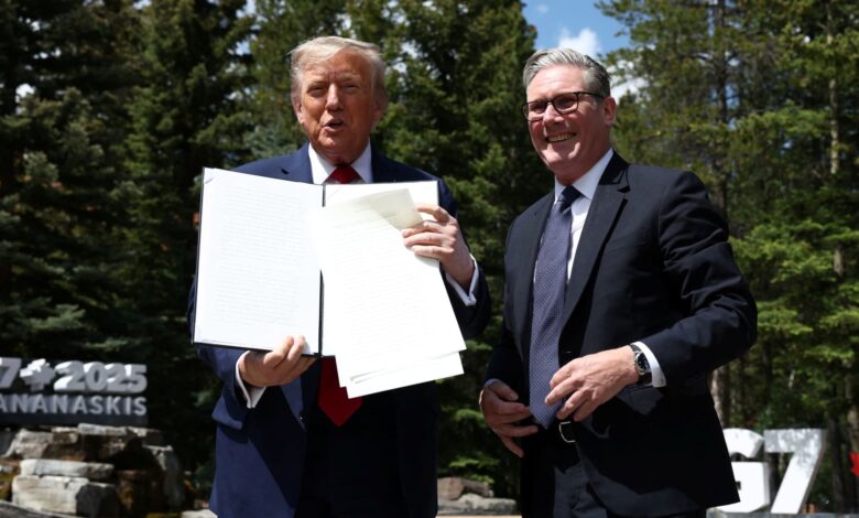 U.S. President Donald Trump and British Prime Minister Keir Starmer react after picking up the trade agreement with the U.K. papers that Trump dropped as they speak to the media during the G7 summit in Kananaskis, Alberta, Canada, June 16, 2025.