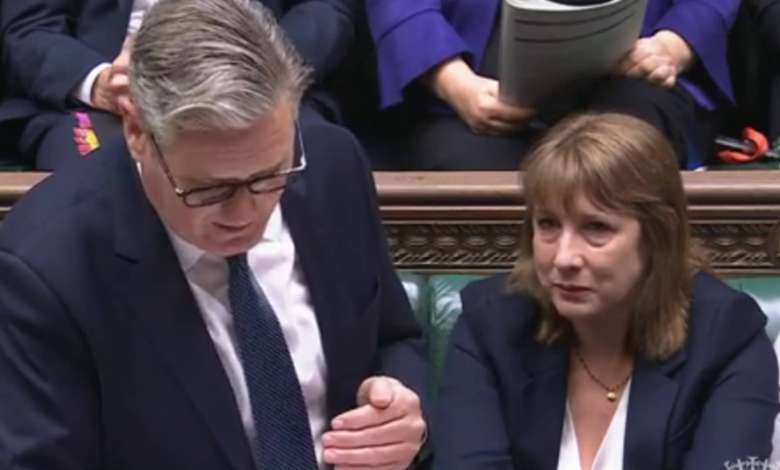 Prime Minister Keir Starmer and Finance Minister Rachel Reeves to his right, looking visibly upset, in the House of Commons on Wednesday.