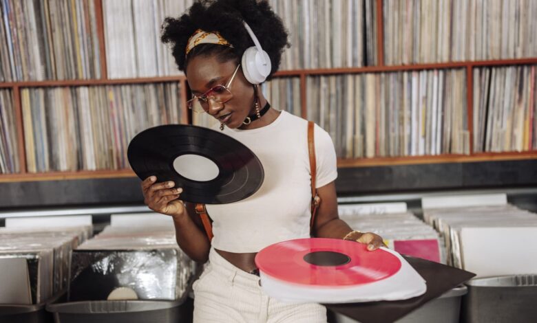A young woman wearing headphones browses vintage vinyl records in a store.